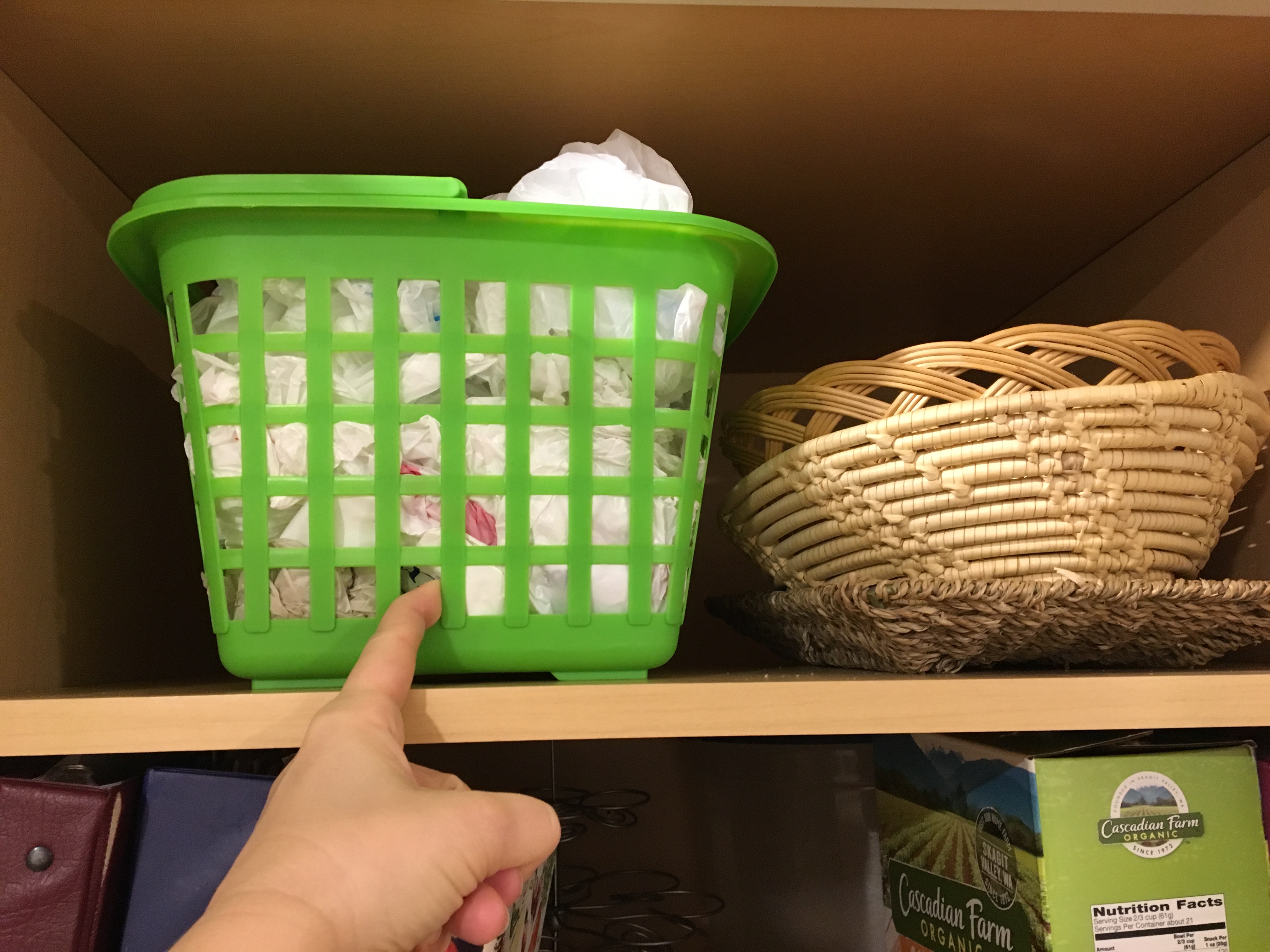 I told you not to make fun of me, but I made fun of my mother for this next suggestion. As always, mother knows best and I wound up loving her hack. She keeps these light weight, basket weaved, plastic containers on higher shelves. Instead of having to use a step stool, she just tiptoes on up, sticks her pointer finger in a bottom square and easily pulls down the bin. I keep extra plastic bags in mine and it makes things super simple. They can also be found in the dollar store, which is super cheap!