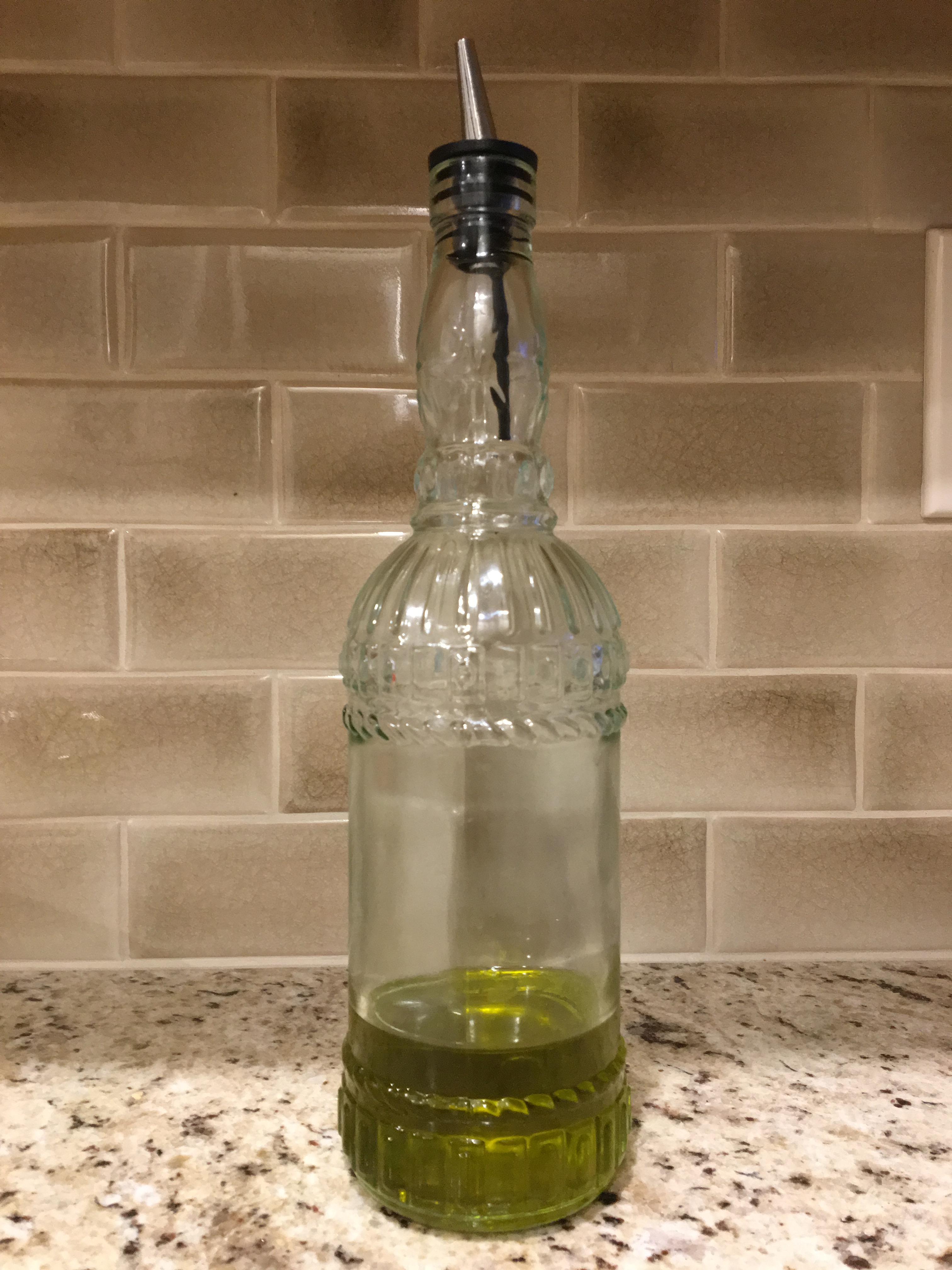 I had also asked if she keeps larger bottle of oils in storage and siphons them gradually into easier to use bottles that either drizzle or mist. Tanya posted a great picture of hers, and above is a picture of mine. The smaller sized bottles wouldn’t be as heavy, and could be kept in a bin, the larger ones stored away until the smaller ones needed some replenishing. It’s also a great money saver to buy the oil in bulk.