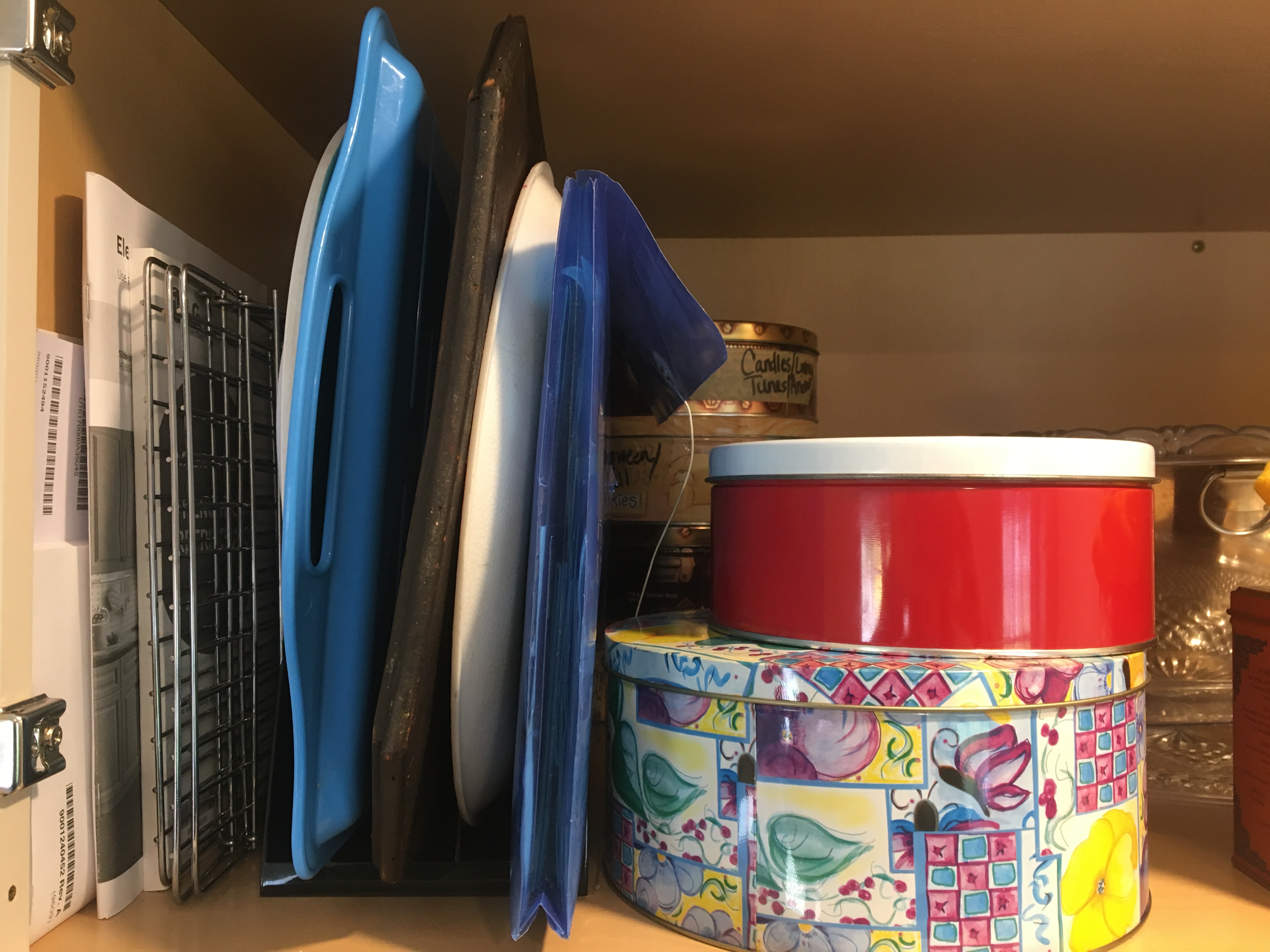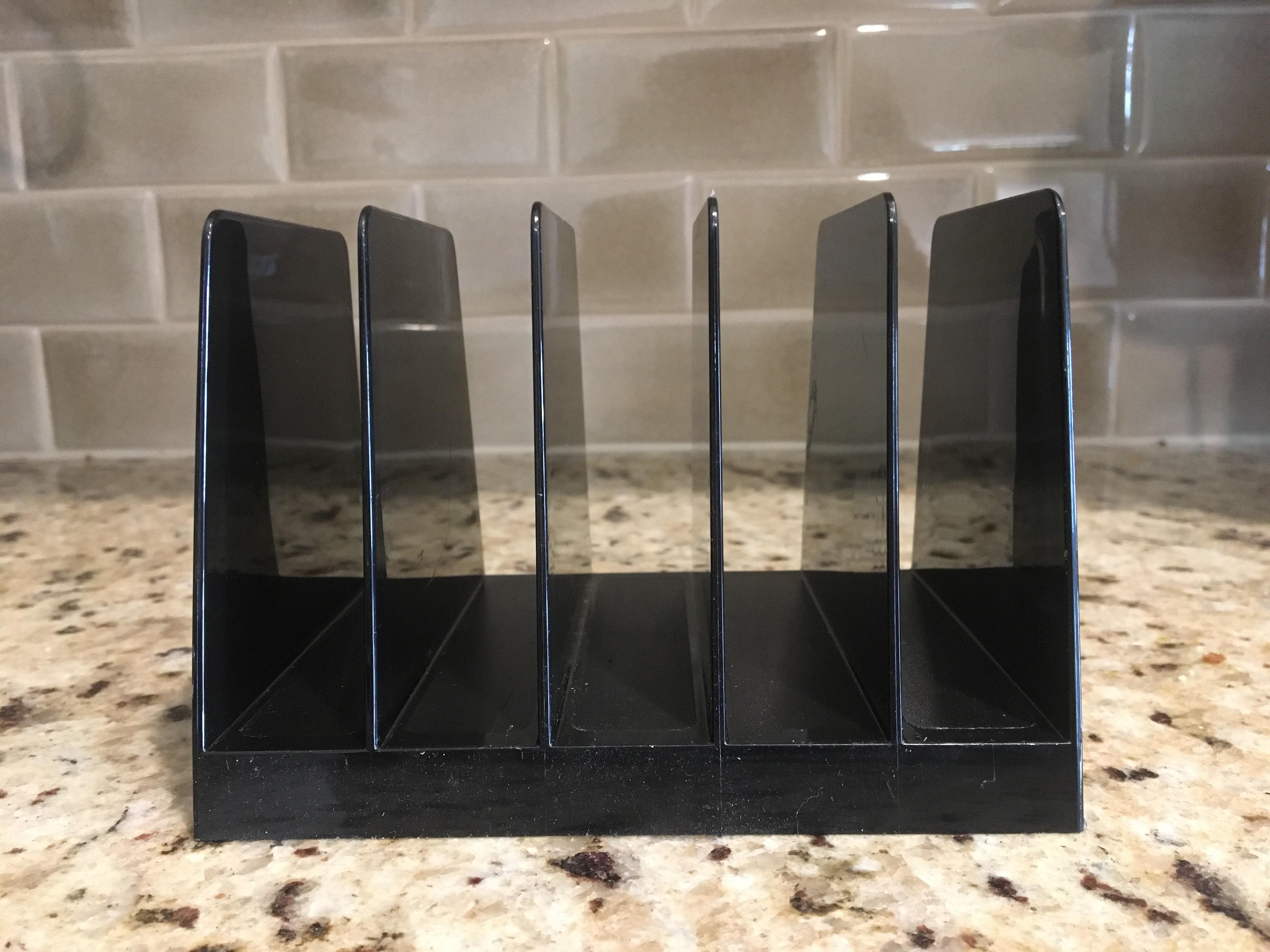 This little, black, horizontal file organizer was no longer needed in my office. Did I find another purpose for it? Yep. It’s in the kitchen, holding my take out menu folder and various serving trays, keeping them neat so they don’t fall over. Again, you can purchase one of these in the Container Store or online, specifically for the kitchen, but here was an office item that now serves me well in a different room with a new function.