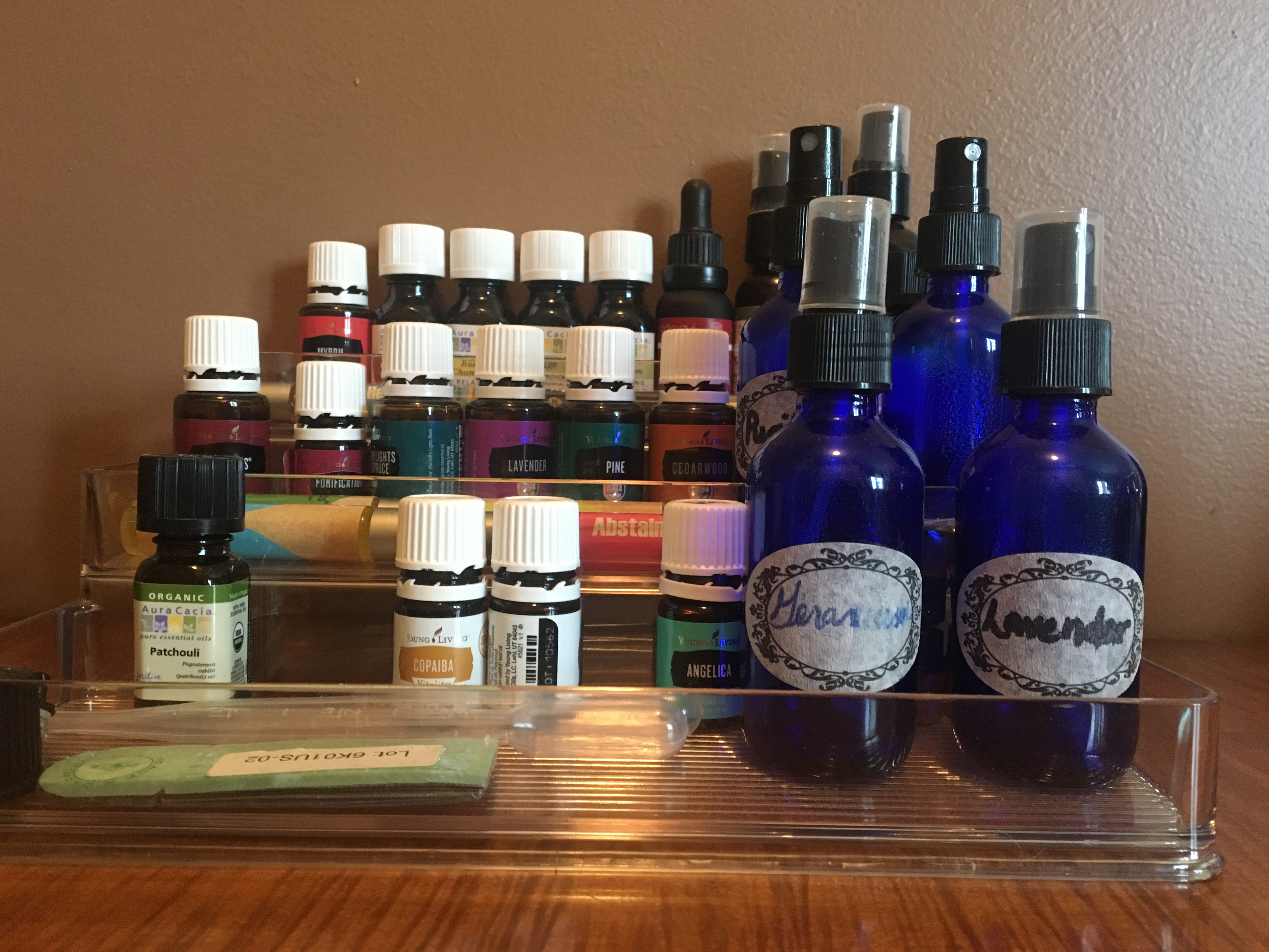 I have this other bad boy up in my bedroom. I use this clear plastic one for storing my essential oils. Like spices, they need to be visually accessible and I don’t want to waste time searching for what I need. Here they are, all lined up and looking pretty, ready for me to peruse the lot for use. The larger platform even allows for me to store some of my bigger jars, and sprays.