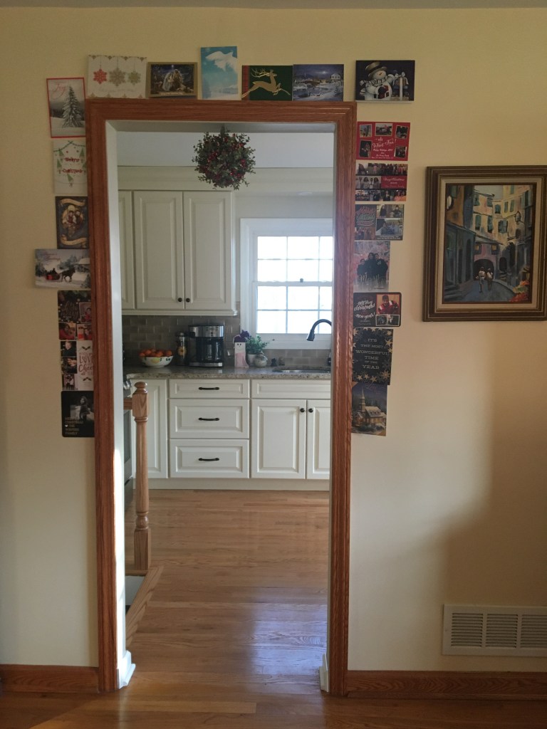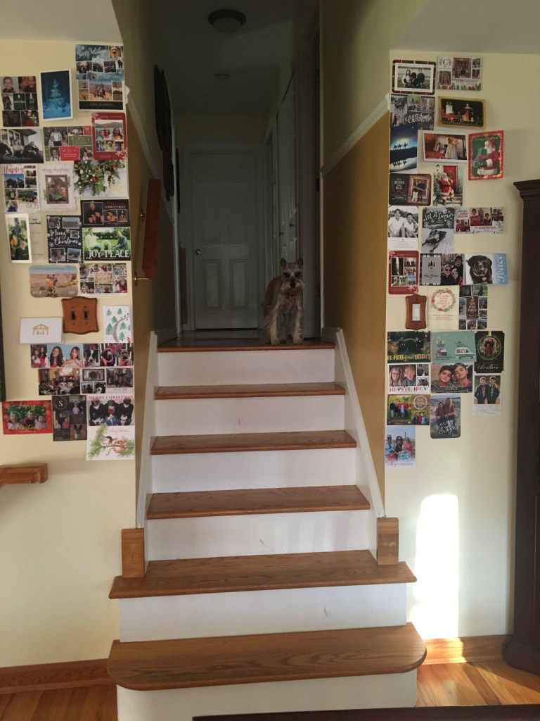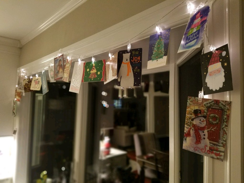 Now witness Exhibit B. My cards. Yes, they are part of the decor, but not displayed nearly as lovely as Renee’s. With the use of Command hooks and pixie lights she has now adorned her home in such a way, good ol’ Martha would be jealous.