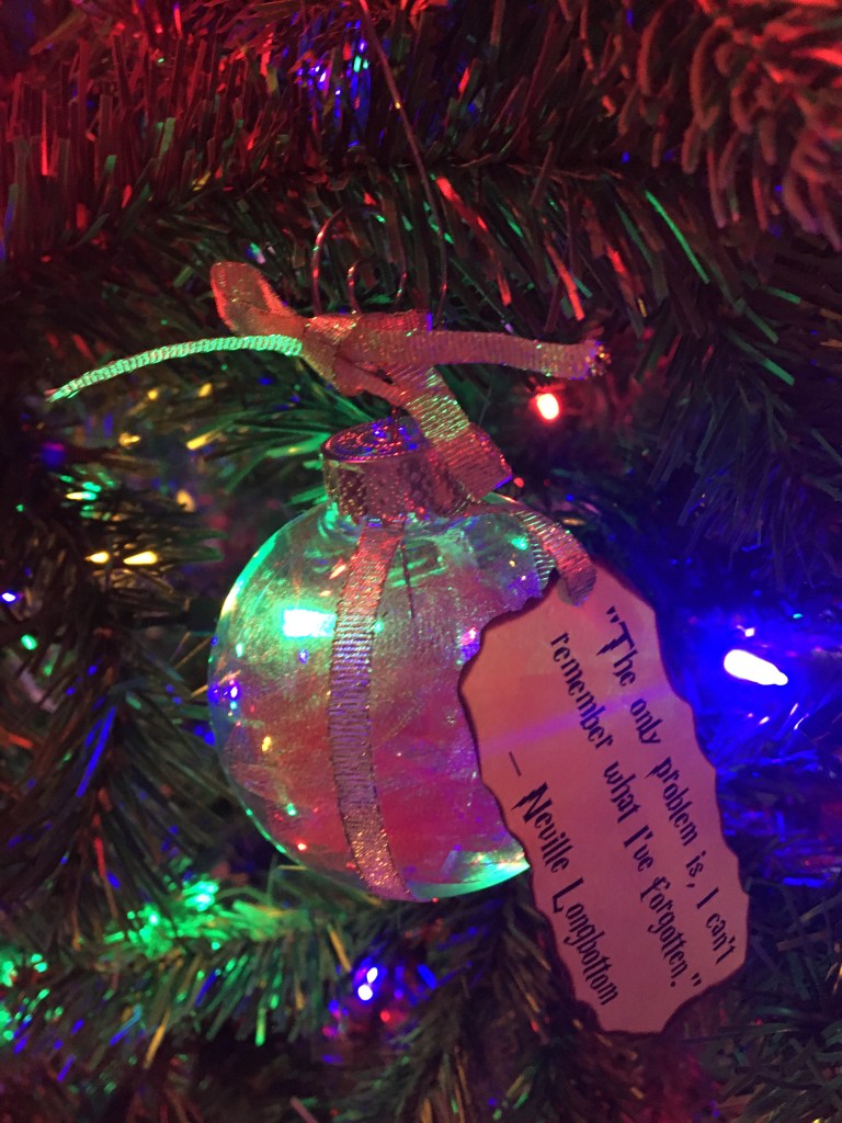 And as I close out, I just thought I might highlight one of my favorites. Presenting, the Remembrall, an ornament that was made for me by my wonderfully creative friend, Tanya. Tanya knows that I have an affinity for Neville Longbottom and gifted me with this beauty. I feel Neville is one of the unsung heroes of the Harry Potter series, and this Remembrall is in honor of him. Despite the fact that Neville is awkward and not gifted with skillful magic power, he unabashedly uses whatever meager magical gifts bestowed upon him, and knows that true power and success lies not only in using the talents you have, (however big or small they may be) but also in loyalty, courage, fighting for good, and standing up to and for friends, whichever may be best for the situation at hand. I try to remember to live a bit like Neville, and this ornament often reminds me to do so. So while this ornament gets hung up on the tree, I’m a bit hung up on Neville. I hope you have some special decorations you cherish, and that they are kept safe and sound throughout the year. Until December, dear ornaments!