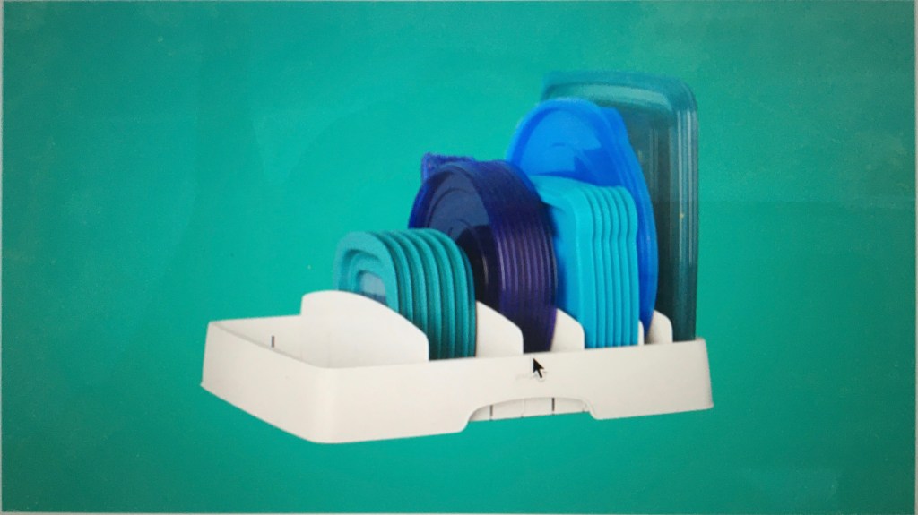 Not too shabby if you ask me, though that’s probably because I put the lids away and not the kids or the hubby. But needless to say, most days my lids are neat and organized by size, color, and shape. Do I really need to spend $20 for this contraption? It seems like I’m doing fine without it. My green, re-purposed Dollar Store bin I’m currently using is good enough.