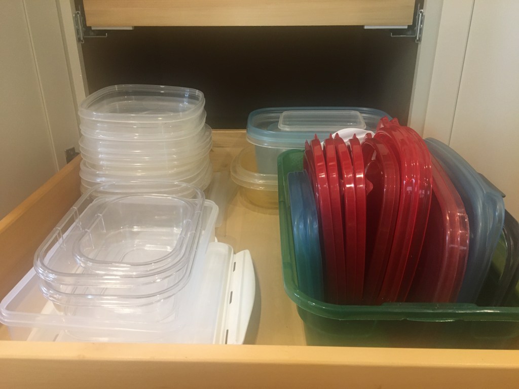 One of the things that caught my attention was this nifty lid organizer. Oh yay! Look how nice and neat all the lids look, stacked together by size, color, and shape. I got super excited. Then I saw the price tag, $12.99, which isn’t an exorbitant amount, but when you throw in shipping and tax, that’s a 20 dollar bill. I went upstairs to my container/lid drawer, which looks like this.