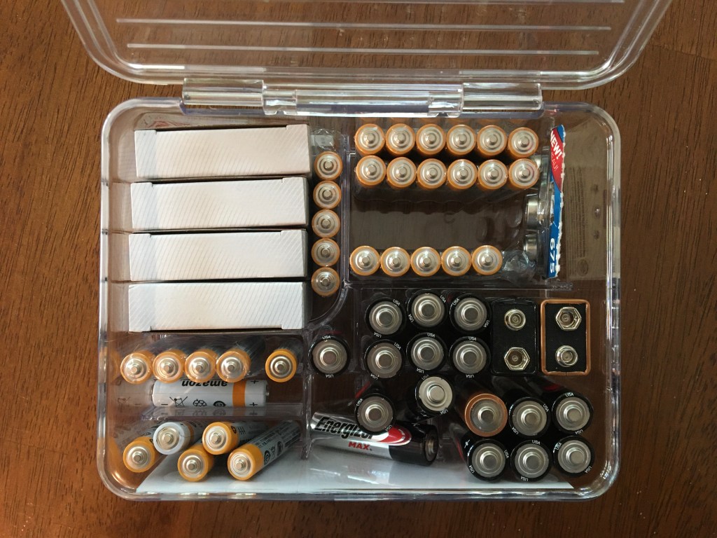 I bought this cutie a while back. It holds all my batteries, even when I buy an abundance of them in bulk at BJ’s. Sometimes they fall over, but the way the sections are set up, the terminals never come in contact with each other when they are askew. They sell similar ones at Walmart and Target, and all three stores had different sizes and shapes to accommodate lots of different needs and spaces. Surprisingly, they are similarly priced at each location.