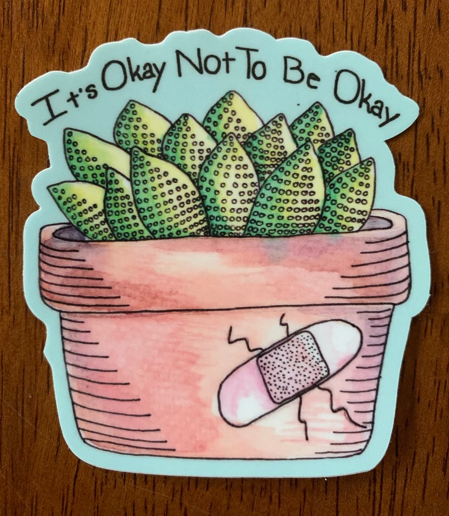 It’s okay not to be okay. Last week my sticker urging me to “Go outside” was spot on, and this week’s sticker is obviously a little bit different. I got this one for my son, as some days he struggles with the isolation of remote learning, and though I’m sure he will never display it or use it, I wanted him to see this message and truly know that it is okay to not be okay. However, today I am the one who is relying on that sticker to validate my feelings.