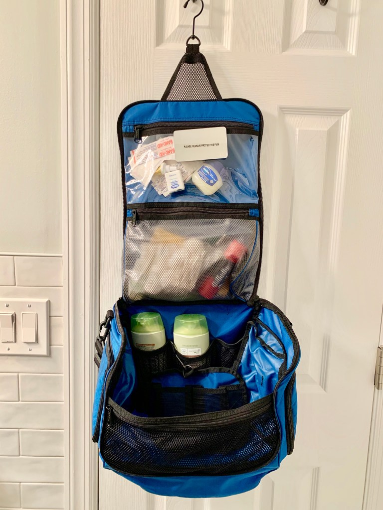 This travel tote was large enough to fit every toiletry one could ever think to travel with, but not too large to complain about taking up space in a suitcase. It was waterproof and sturdily made. It had four separate compartments of varying sizes which could contain any accidental spillage, and three of those could be easily removed, as they were attached with velcro. Best of all, I kept it packed and at the ready, so if we ever needed to travel or decided on a spontaneous weekend trip, voila! The bag was sitting there for the taking. That was the magic of it. I never had to worry about toiletry packing as long as I had this bad boy ready to go.