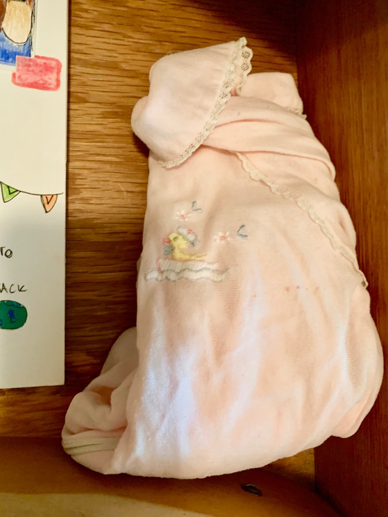 My mother passed this on to me a few years ago when she was cleaning out her basement. I, in turn, gave it a home in my basement. I stumble upon it each year as I do my clearing out, and I’m surprised this has still made the “keep” cut. While it absolutely fascinates me that I was small enough to fit into this, it serves no purpose. I pull it out, look at it in amazement, and then put it right back in the bin. If I don’t get rid of it, my daughter will someday be guilted in to keeping it. She will pull it out of her bin and say to her grandkids, “Your great-grandma Jenny came home from the hospital in this.”