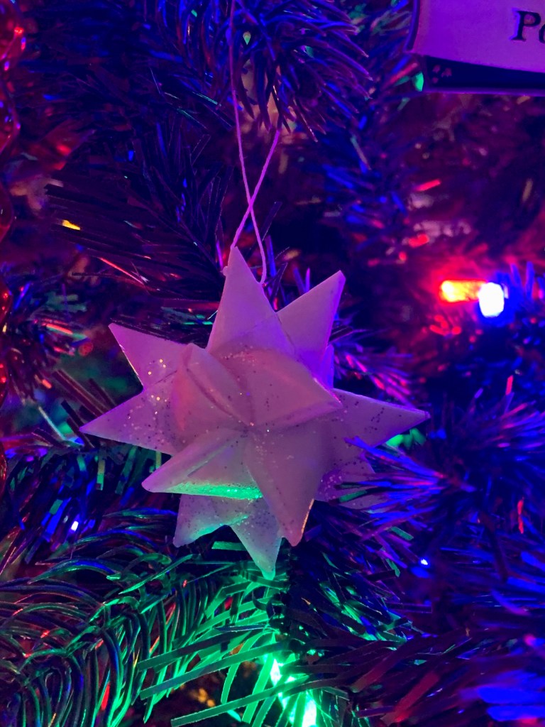 There’s the Santa we bought at Fortunoff, just before they closed down. Every year we would go with my parents and brother’s family at the start of the holiday season, looking at the trains, trees, and Christmas villages. It made my heart sing. Visiting the Christmas museum in Pennsylvania replaced this tradition until that too, closed down, but the German star ornament we purchased there reminds me of those good times. One year, two busses full of senior citizens pulled in the lot ahead of us and my dad went nuts. “They have no right,” he yelled! Certainly, they did have a right to visit the museum but apparently, not ahead of my dad. He went racing in, and to this day, Paul and I get hysterical when we think of it.