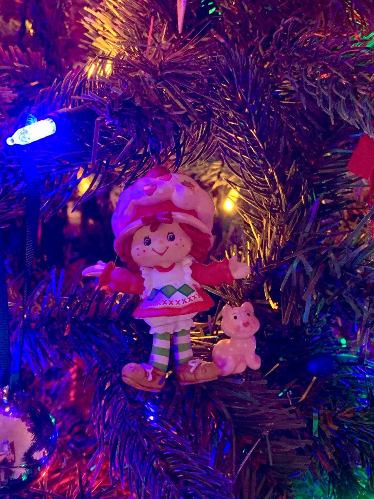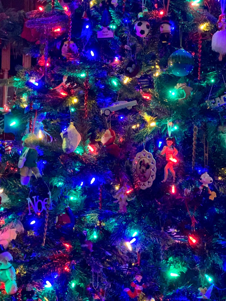 One of my besties, Carrie, is well represented here. The Rent ornament she gave me hangs proudly, as well as the leaping dolphin. Thoughts of her bring me peace and joy like no other. We lived in the city together and every year at Christmas, we would scour Broadway or Amsterdam looking for the perfect tree. We usually found it on 96th and Broadway, and we would literally, no joke folks, carry the tree home with me at the front and Carolyn at the back, skipping and singing “Oh Christmas Tree,” as exuberantly as we could. This always makes me smile.